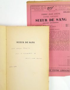 Pierre-Jean JOUVE (1887-1976, poète et romancier) / « Sueur de Sang », NRF Gallimard, 1935, éd. or. Numérotée, service de presse, 163 p (rousseurs sur couverture), avis de parution conservé, avec envoi autographe signé à l’écrivain belge Charles Plisnier