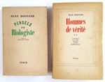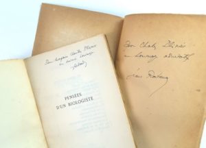 Jean ROSTAND (1894-1977, biologiste et écrivain de l’Académie française) / « Pensées d’un biologiste », Stock, 1939, éd. or., service de presse, broché 156 p in-8, avec envoi autographe signé à l’écrivain belge Charles Plisnier et « Hommes de vérité », Stock, 1948, éd. or., service de presse, broché 221 p in-8, avec envoi autographe signé à l’écrivain belge Charles Plisnier