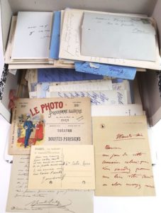 AUTOGRAPHES – THEATRE XIX° début XX° / Ensemble de plus de 320 lettres ou cartes autographes de gens de théâtre : Mlle Agar, Antoine (8), Jeanne Avril, Berthe Bady, Berton Père (3), Madame Bianca, Georges Biscot (4), Bocage, Berthe Bovy (4), Lucien Boyer (3), Cécile Caron, Clairville, Constant Coquelin, Coquelin Cadet (18), Marthe Derminy, Suzanne Desprès (2), Marguerite Deval (16), Gabrielle Dorziat, Huguette Duflos (2), Raphael Duflos (4), Louis Dumaine (4), Dussane, Marie Favart (7), Maurice de Féraudy (12), Frédéric Febvre, Victor Francen (3), Félix Galipeau (3), Firmin Gémier (14), Jeanne Granier (4), Adolphe Laferrière (4), Albert Lambert (4), Albert-Lambert Fils (5), Judith, Marie Laporte (2), Charles Le Bargy (6), Simone Le Bargy (6), Léonide Leblanc, Marie Leconte (4), Jeanne Marni, Louis Monrose, Georges Monval (2), Jacques Monval (16), Mounet-Sully, Georges Noblet (9), Parisys, Blanche Pierson (2), Polaire, Porel (5), Eugène de Pradel, Marthe Régnier (5), Gabrielle Robinne, Roselia Rousseil, Saint-Germain (15), Mlle Scriwanek (5), Segon-Weber (2), Véra Sergine (2), Silvain (8), Cécile Sorel, Madame Théodore (plus portrait), Jules Truffier (5 plus manuscrit aut.sign.), Yahne (3), etc. - / Joint : « Le Photo-Programme illustré » du Théâtre des Bouffes-Parisiens de 1900