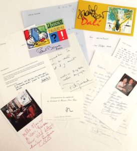 AUTOGRAPHES – Personnalités contemporaines : ensemble de 22 lettres ou cartes autographes signées : Pierre Bergé, Stéphane Berne, Paul Bocuse, Jean Borotra, Philippe Bouvard, Laurent Boyer, Carla Bruni-Sarkozy, Nicole Calfan, Hélène Carrère d’Encausse, Jean-Claude Casadesus, Jean-Philippe Goude, Roger Hanin, Amanda Lear, Fabrice Luchini, Pierre Mauroy, Christian Millau, Nicole Garcia, Line Renaud, Pascal Sevran, Yves Simon, Peter Townsend (2)