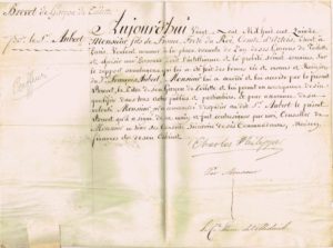 COIFFURE - Charles Philippe de France Comte d'ARTOIS (1757-1836, Frère des Rois Louis XVI et Louis XVIII, Roi de France et de Navarre de 1824 à 1830 sous le nom de Charles X) / Brevet sur vélin (32,5 x 24 cm) signé de sa main "Charles Philippe" et contresigné par son Secrétaire des Commandements le Comte de Villedeuil, sceau pendant de cire rouge à ses Armes, donné à Paris le 20 août 1815 : "Monsieur, Fils de France, Frère du Roi, Comte d'Artois" accorde à François Aubert par le présente brevet le titre de "son Garçon de Toilette" (coiffeur) - François Aubert, "sur le rapport avantageux qui lui a été fait des bonnes vie et mœurs" est qualifié de "Personne dont l'intelligence et la probité soient connus"