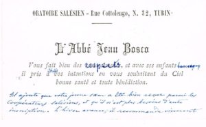 SAINT JEAN BOSCO [1815-1888, prêtre italien canonisé en 1934) / Carte de visite à son nom avec correspondance écrite de sa main (9 x 5,5 cm) : Don Bosco a corrigé le message habituel de remerciement de sa carte et a continué son message à la troisième personne : « Il ajoute que votre jeune sœur a été bien reçue parmi les coopérateurs salésiens, et qu'il n'est plus besoin d'autre inscription. L'hiver avance, il recommande vivement ses pauvres orphelins à votre généreuse charité, et il prie Dieu qui a dit : donnez et on donnera à vous, afin qu'il récompense largement toute bienfaisance que vous voudrez nous user. Le bulletin manquant sera envoyé bientôt ; aussi on enverra dans peu de temps les diplômes de coopération aux personnes indiquées »