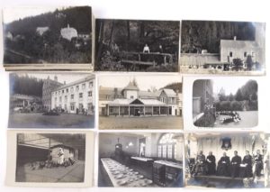 BELGIQUE – Province de Namur – Château de Burnot » (après avoir été la propriété de l’écrivain Camille Lemonnier, il fut racheté par les Chanoinesses de Saint-Augustin de Reims, chassées par la Loi Combes, pour héberger leur communauté et ouvrir un pensionnat de jeunes filles) / Ensemble de plus de 70 photographies originales (cartes postales), Années 1910, la plupart soigneusement légendées à la plume : vues extérieures, parc, intérieur (dont chambre du Cardinal Luçon), activités des sœurs, des pensionnaires, etc. – 4 de ces cartes ont voyagées, une a été écrite par la Sœur Supérieure Sainte-Scholastique
