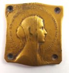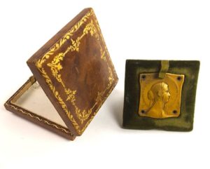 AVIATION – Médaille de Notre-Dame du Platin, plaquée or mat (poinçon « PR »), signée du sculpteur Michail JAMPOLSKY, éditée par Jouan, l’avers est un profil de la Sainte avec « Notre-Dame du Platin Protectrice des Aviateurs, Années 1920 – Regarde la et prends ton vol » et le revers une vue du Platin – Présentée en écrin inclinable en cuir brun - 4 trous aux coins percés pour éventuellement fixer la médaille sur le tableau de bord (les 4 vis sont toujours présentes dans l’écrin)