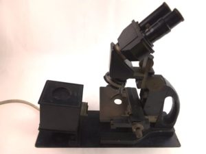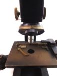 SCIENCES – Maurice STIASSNIE (opticien constructeur de microscopes actif à Paris de 1885 à 1922) / Important microscope binoculaire avec une tourelle à 4 objectifs, poignée de transport intégrée, présenté sur une base métallique équipée d’un système d’éclairage (hauteur 28 cm, largeur hors tout 40 cm)