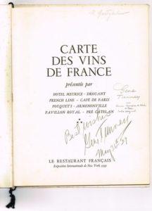 BOXE - Gene TUNNEY (1897-1978, Boxeur américain Champion du Monde des Poids-Lourds de 1926 à 1928) / Sa signature (de sa main) avec "Best Wishes" et date autographe, 26 mai 1939, sur la première page de la carte des vins du "Restaurant Français" de l'Exposition Internationale de New York : Belle carte des vins, 10 p grand in-4 plus couverture illustrée par l'espagnol Benito, imprimée par Draeger à Paris - Le Restaurant Français de l'Exposition Internationale de New York était tenu notamment par l'Hôtel Meurice, Drouant, le Fouquet's, le Pré Catelan