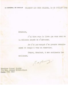 Charles de GAULLE (1890-1970, Général, résistant, Président de la République Française de 1959 à 1969) / Lettre dactylographiée signée de sa main, 1 p in-4, en-tête "Le Général de Gaulle", Colombey Les Deux Eglises, 20 juillet 1946, au poète Marcel FARGES : Le Général a bien reçu le livre que "vous avez eu la délicate pensée de m'adresser", "Je n'ai pas manqué d'en prendre connaissance et tenais à vous en remercier" [Marcel Farges venait de faire paraître aux "Cahiers poétiques français" un recueil : "La Douceur d'aimer" - Le Général, démissionnaire le 20 janvier 1946 du Gouvernement provisoire de la République française, entamait sa fameuse "traversée du désert"]