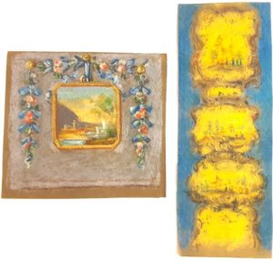 DESSINS XVIII° / Dessins originaux à l’aquarelle, gouache et craies (22 x 20 cm et 12,5 x 34,5) : "Etudes de décors pour papier peint