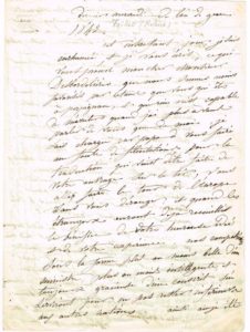 BAYONNE – BEAUX-ARTS – Famille FEILLET, Peintres - Pierre FEILLET (1794-1855), Hélène FEILLET (1812-1889), Blanche FEILLET (1815-1886) / Lettre écrite et signée de la main de Hélène Feillet, avec à la suite correspondance écrite et signée de la main de son père Pierre Feillet et de sa sœur Blanche Feillet, 4 p petit in-4, Bayonne, 27 décembre 1842, à un ami de la famille, le Capitaine Albert Desbordelières à Perpignan : Amicale missive de la famille Feillet, qui donne des nouvelles et formule ses vœux de bonne année - Hélène Feillet fait une annonce importante : "J'ai reçu la lettre officielle qui me donne à faire le tableau de l'hôpital - La toile est déjà cousue, je n'aurai plus qu'à peindre - Par exemple, ce n'est pas le plus facile à faire, mais jamais ouvrage ne m'aura plus intéressé, je ne m'y épargnerai pas, au moins si je pars même pour l'autre monde, laisserai-je un souvenir à Bayonne et à mes amis, mais n'allez jamais à l'hôpital militaire qu'en ami je vous prie - Le sujet est Saint-Louis relevant les blessés d'un champ de bataille" [C'est pour la Chapelle de l'Hôpital Militaire de Bayonne que Hélène Feillet reçut cette commande de tableau monumental qui sera intitulé : "Saint-Louis parcourant un champ de bataille et faisant donner des secours aux blessés"] - Pierre Feillet se rappelle au bon souvenir de son ami : "Comme vous devrez profiter de votre printemps perpétuel, dans vos courses, ramassez tout ce que vous trouverez en coquilles et minéraux, je collectionne toujours"
