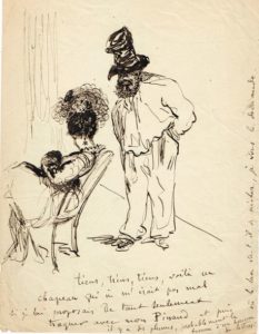 CHAM (Amédée de Noé dit, 1818-1879, Dessinateur humoristique de presse) / Dessin original à l'encre noire exécuté de sa main avec légende autographe (15,5 x 20 cm) : "Tiens, tiens, tiens, voilà un chapeau qui ne m'irait pas mal, si je lui proposais de tout seulement troquer avec mon Pinaud, et puis il y a des plumes, notablement la femme d'un homme de lettres - Où le luxe va-t-il se nicher, je vous le demande" [Le chapelier parisien Pinaud popularisa le haut-de-forme]