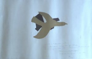 [Georges BRAQUE] – Heger de LÖWENFELD (1912-2000, diamantaire et joaillier) – Il réalisa la Collection des « Bijoux de Braque » d’après les gouaches du peintre Georges Braque / « Céphale », estampe (39 x 84,5 cm) gaufrée à l’or sur papier blanc brillant, éditée en 19179 par Zanders (cachet rond à sec), c’est le Baron de Löwenfeld qui en assura la gravure – Cette épreuve est enrichie d’une dédicace de 1987, du Baron de Löwenfeld à l’artiste Philippe Clay