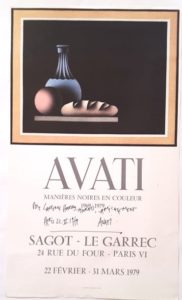 BEAUX-ARTS – Mario AVATI (Monaco 1921-2009, peintre et graveur élève d’Edouard Goerg) / 1°) Ensemble de 3 affiches de galeries signées de sa main (Sagot-Le Garec Paris, Arcadia Paris et Ciento Barcelone), tirées sur beau papier (38 x 64 cm, 45 x 83 cm, 50 x 65,5 cm, une déchirure) 2°) Gravure originale signée de 1968 (14 x 12 cm) 3°) Bloc de 4 vignettes dentelées gravées, « Salut à Courbet », avec dédicace autographe de 1980 – Joint : affiche et 2 documents
