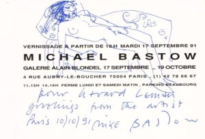 Michael BASTOW (né en 1943, Peintre britannique) / Dessin original exécuté, dédicacé et signé de sa main en 1991 sur une invitation à un vernissage à la Galerie Alain Blondel à Paris (15,5 x 11 cm) - Au dos reproduction d'une de ses œuvres