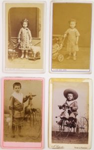 PHOTOGRAPHIE – ENFANTINA / Ensemble de 4 photographies originales XIX°, format carte de visite (6,5 x 10,5 cm) représentant des enfants avec leurs jouets