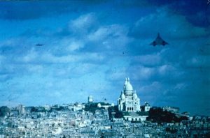 PHOTOGRAPHIE - Gösta WILANDER (1896-1982, Photographe suédois, surnommé "le piéton suédois de Paris", il photographia Paris et la vie parisienne - Le Musée Carnavalet conserve ses clichés) / Photographie originale, tirage Kodachrome (13,5 x 9 cm), avec message amical écrit et signé de sa main au dos : "Le Concorde vole au dessus du Sacré Cœur de Paris" – RARE