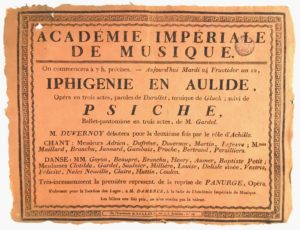 DANSE - ACADEMIE IMPERIALE DE MUSIQUE / Placard (affiche de 45 x 35 cm) avec encadrement décoratif annonçant le programme de la journée du mardi 24 fructidor An 12 (11 septembre 1804), Imprimerie Ballard, cachet à taxes : "Iphigénie en Aulide" (opéra en 3 actes, paroles de Durollet, musique de Gluck) suivi de "Psiche" (Ballet-pantomime en 3 actes de Gardel), Courte liste des chanteuses, chanteurs, danseuses et danseurs – RARE (Très petit tirage)