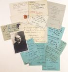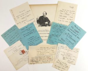 MUSIQUE – Jules MASSENET (1842-1912, compositeur) / Importante correspondance autographe signée (19 documents) de 9 lettres pneumatiques, 6 lettres, 3 cartes et 1 carte de visite (non signée mais autographe), 4 enveloppes, Années 1910, au Secrétaire Général de l’Opéra-Comique Georges Ricou (1880-1954) : instructions pour les répétitions de « Thérèse », envoi de la partition de « Réverie », message pour Marguerite carré, envoi de musique, réservation de places, remerciements émus etc. – Joints : photographie (carte postale) et encart Mariani