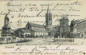MUSIQUE - Edouard RISLER (1873-1929, Pianiste) / Carte postale autographe signée, Eisenach (Prusse), 4 septembre 1910, à son ami le compositeur Reynaldo Hahn, qu’il charge de remettre au chef d'orchestre Walther Straram : il a ajouté une portée de musique et précisé que la statue sur la place est celle de Luther