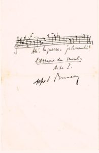 MUSIQUE - Alfred BRUNEAU (1857-1934, Compositeur) / Petit manuscrit musical écrit et signé de sa main, 1 p in-8 : Il donne un extrait du premier acte de son opéra "L'Attaque du Moulin", "Ah ! la guerre, je la maudis !" [Opéra tiré de la nouvelle éponyme d'Emile Zola]