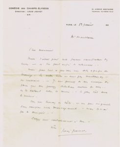 THEATRE - Louis JOUVET (1887-1951, Comédien, metteur en scène et directeur de théâtres) / Lettre autographe signée, 1 p in-4, en-tête "Comédie des Champs-Elysées", Paris, 19 février 1925, à René Maublanc (1891-1960, Philosophe humaniste, syndicaliste, écrivain, pacifiste, ami de Jules Romains), enveloppe conservée jointe : La Première du "Mariage de Monsieur Le Trouhadec", pièce de Jules Romains, avait eu lieu le 31 janvier 1925 à la Comédie des Champs-Elysées - Louis Jouvet en jouait le rôle principal (Yves Le Trouhadec), en assurait la mise en scène et en avait créé les décors - "Merci d'abord pour cette joyeuse classification des cocus - où l'on peut enfin se retrouver - Merci pour tout ce que vous me dites à propos de "Mariage" - Les salles hélas ne sont pas meilleures - au contraire - Je me permets de vous envoyer des places que vous pourrez distribuer autour de vous, en les datant selon le besoin - le plus tôt sera le mieux - Vous me trouvez en hâte, et un peu inquiet sans compter mon découragement - mais je n'ai pas de désespoir" [La pièce n'eut que 35 représentations]