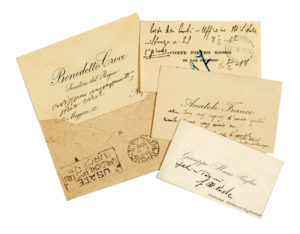 La raccolta comprende biglietti da visita di: Mario Soldati, Anatole France, Benedetto Croce, Antonio Fogazzaro, l’ammiraglio Thaon di Revel (2), Sidney Sonnino, Vittorio Emanuele Orlando (3), Cesare Pascarella, il baritono Giuseppe Viggiani, Giuseppe Pitrè, Ernesto Basile, Luigi Natoli, Corrado Segre (2), Pietro Russo di San Secondo, Giuseppe Maria Puglia, Aurelio Drago, Walter Legge, ecc.