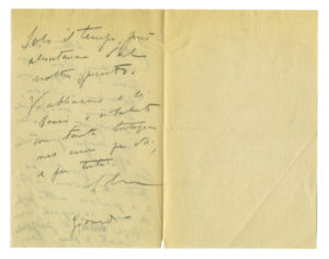 IV DOCUMENTO: Chère Trude, un salut au moment de partir. Suis dans la nécessité d’aller à Florence pour quelque jour. Bon Salut. Aurevoir dans 2 ou 3 semaines. Serai chez Caterina. Tendrement E. Duse