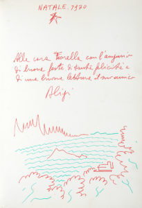 “Natale 1970. Alla cara Fiorella con l’augurio di buone feste, di tanta felicità e di una buona lettura. Il suo amico Aligi [segue il disegno]”.