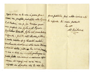 La lettera è inviata al pittore Silvestro Lega a proposito dell’esposizione a Londra del celebre ritratto “Mazzini morente”. “[...] mi affretto di rispondergli senz’indugio, pregandola tuttavia di scusare gli errori che potrò fare per non essere avvezzo a scrivere in italiano. Mi sarebbe cosa gratissima di poter aiutare al suo disegno di fare una sposizione in Londra del suo ritratto di quell’illustrissimo che mi onorava della sua amicizia; ma di me stesso non saprei come si dovrebbe ordinare un tal negozio. Scrivo adunque a due affini miei amici [...] alla Signora E. A. Venturi, che fu per Mazzini quasi una propria figlia, e al Signor Guglielmo Rossetti, figlio del commentatore di Dante e fratello dell’illustre pittore [...]. se mi viene risposto da Londra che la cosa le pare possibile, farò subito inviare a Lei la risposta [...]”.