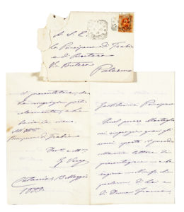 «Gentilissima Principessa, quel povero Martaglia mi ringrazia quasi gli avessi aperto il paradiso colla mia lettera di presentazione e ha ragione. Non fa che parlarmi di lei e di Donna Franca [madre di Giulia, l’affascinante e coltissima Franca Florio, che il Kaiser Guglielmo II definì Stella d’Italia], così belle, buone, gentili, e della cortesia veramente signorile che ha trovato da loro, nella bella, buona, gentile società palermitana. E ha ragione due volte. Perché questo lo so anch’io, e ne serbo sempre grata e simpaticissima memoria. […] egli ed io siamo stati fortunatissimi perché Ella, in assenza di suo marito, abbia voluto farci l’onore di accogliere benevolmente il presentato, e il presentatore, che la ringrazia particolarmente e le bacia la mano […] G. Verga".