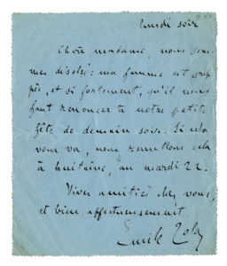 “Lundi soir, chère madame, nous sommes désolés : ma femme est grippée, et si fortement, qu’il nous faut renoncer à notre petite fête de demain soir. Si cela vous va, nous remettrons cela à huitaine, au mardi 22. Vives amitiés chez vous et bien affectueusement Emile Zola”. La destinataria è la moglie di Georges Charpentier, editore e amico di Zola. Come d’uso all’epoca la signora è indicata non solo con il cognome, ma anche con il nome del marito.