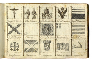 Il manoscritto contiene stemmi di famiglie italiane e straniere, insieme a bandiere europee e del nord Africa. Seguono i “Dignites Ecclesiastiques” e “Dignités Politiques”.