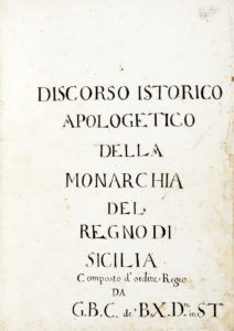 CARUSO Giovanni Battista, Discorso storico apologetico della monarchia del Regno di Sicilia. Seconda metà del XVIII secolo.