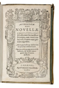 3) Authenticae seu Nouellae Constitutiones D. Iustiniani sacratissimi principis, cum veteri translatione, Graecis nunc primùm apposita... Lugduni : apud Gulielmum Rovillium, 1581. In-16° (mm 116x70).