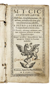 Cicero Marcus Tullius, Sententiarum illustrium apophthegmatum, similium, nonnullarum item piarum sententiarum collectio... Taurini : apud Io. Bap. Ratterium, 1584. In-12° (mm 132x170).