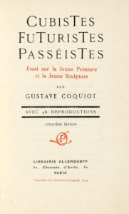 COQUIOT Gustave, Cubistes Futuristes Passéistes. Essai sur la Jeune Peinture et la Jeune Sculpture [...] avec 48 reproductions. Cinquième Édition. Paris : Librairie Ollendorff, 1914. In-16° (mm 195x130).