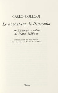 COLLODI Carlo, Le avventure di Pinocchio [...] Con una nota di Achille Benito Oliva. Roma : Edizioni Theoria, 1992. In-8° (mm 210x135).