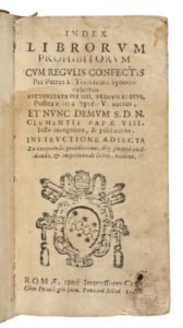 INDEX LIBRORUM PROHIBITORUM, cum regulis confectis per patres a Trident... Romae, & Bon. : apud haered. Io. Rossij, sumptibus Impressorum Cam. Roman., 1596. In-12° (mm 142x70).