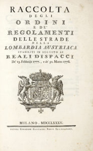 RACCOLTA DEGLI ORDINI E DE' REGOLAMENTI DELLE STRADE DELLA LOMBARDIA AUSTRIACA... Milano : presso Giuseppe Galeazzi, 1785. In-4° (mm 333x210).