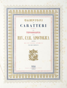 CAMPIONI DEI CARATTERI ESISTENTI NELLA TIPOGRAFIA DELLA REV. CAM. APOSTOLICA PRECEDUTI DA UN CENNO STORICO SULL'ARTE TIPOGRAFICA. Roma : Tipografia della Rev. Cam. Apostolica, 1853. In folio (mm 340x260).
