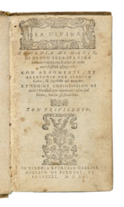 Rara e ricercata edizione della Commedia curata da Ludovico Dolce, l'unica impressa dai Giolito e la prima opera a stampa in cui compaia nel titolo l'epiteto divina : «In questa del 1555 per la prima volta si disse divina l'opera sua, e Divina Comedia fu poi il titolo accettato da tutto il mondo e ripetuto nella maggior parte delle edizioni» (Bongi I, 475-476) ; De Batines 90 : «rara e nitida edizione in caratteri corsivi»; Gamba 389 ; Mambelli 39. Esemplare conforme alla variante C censita da ICCU.