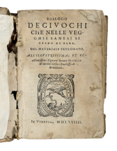 BARGAGLI Girolamo, Dialogo de' giuochi che nelle vegghie sanesi si usano di fare. In Venetia, 1574 (Al colophon:) In Venetia : Appresso Gio. Antonio Bertano, 1574. In-8° (mm 184x100).