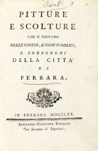 BAROTTI Cesare, Pitture e scolture che si trovano nelle chiese, luoghi pubblici, e sobborghi della città di Ferrara. In Ferrara : Appresso Giuseppe Rinaldi, 1770. In-8° (mm 195x134).