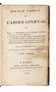 BOUSQUET J., Nouveau tableau de l'amour conjugal. Tome premiere (-second). Paris : Chez Crevot, 1820. 2 parti in 1 volume in-8° (mm 165x93).