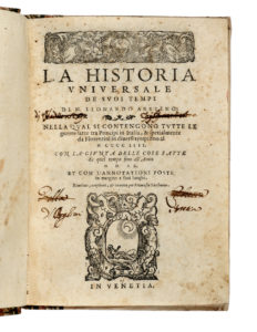 BRUNI Leonardo, La Historia universale de suoi tempi... In Venetia : s.e., s.l. (Al colophon:) In Venetia : appresso Fran. Sansovino, 1561. In-4° (mm 195x145).