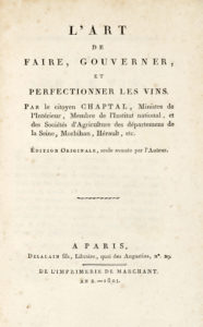 CHAPTAL Jean Antoine Claude, L'art de faire, gouverner, et perfectionner les vins. A Paris : Delalain fils, libraire, quai des Augustins, n. 29, an X 1801. In-8° (mm 215x315).