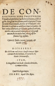 CURIO Johann, De conservanda bona valetudine opusculum [...] cum Arnoldi Novicomensis ... Enarrationibus utilissimis... Franc[ofurti] : apud Chr[istianum] Egen[olphum], [1551]. In-8° (mm 153x100).