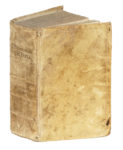 Legatura in piena pergamena rigida con titolo manoscritto al dorso.