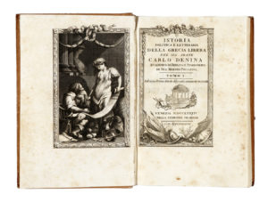 DENINA Carlo, Istoria politica e letteraria della Grecia libera [...] Tomo I [-IV]. Venezia : nella stamperia Graziosi, 1784. 4 volumi in-8° (mm 230x160).
