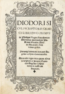 DIODORUS Siculus, Libri duo, primus de Philippi regis Macedoniae : aliorumque quorundam illustrium ducum : alter de Alexandri filii rebus gestis. (Al colophon:) Impressum Venetiis : per Ioannem de Tridino alias Tachuinum, 1517 Die XIIII Maii. In...