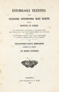 DISCONZI Francesco, Entomologia vicentina, ossia Catalogo sistematico degl'insetti della provincia di Vicenza... Fascicolo primo (-terzo ed ultimo). Padova : Tipografia di G. B. Randi, 1865. 3 fascicoli in-8° grande (mm 250x163).